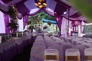 RESEPSI. Acara kedua dari rangkaian acara hari itu. Di penuhi dengan nuansa ungu, yang memang warnai yang kusukai. Percaya gak percaya….hari itu saya sangat puas dengan pelayanan dari ifoel salon. Saya suka warna ungu tendanya, saya suka tendanya, suka sama dekornya yang mana masjid yang semula sederhana disulap jadi indah. Dengan lapangan RW 24 yang biasa dibuat untuk olahraga disulap jadi suatu ruangan yang asik deh pokoknya. Walaupun ada miss sedikit, saat penganten masuk ruangan resepsi harusnya diiringi sama marawis, ternyata marawis nya udah pulang duluan. Tapi gak sedih-sedih banget, kembali ade (baca:Ria) menjadi pahlawan bagi saya, dia teringat dengan keinginan saya.
